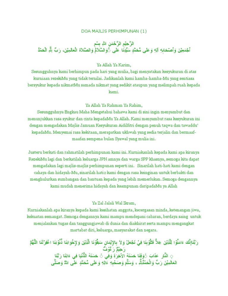 . Bantuan audio dan transliterasi rumi juga turut disertakan dalam doa tersebut bagi. Kurniakanlah kepada kami apa kiranya RezekiMu lagi dan berkatilah keluarga JPN amnya dan warga SPP khasnya semoga kita dapat mengadakan lagi majlis-majlis perhimpunan seperti ini. Berikut adalah teks doa yang telah saya susun untuk majlis doa tersebut.